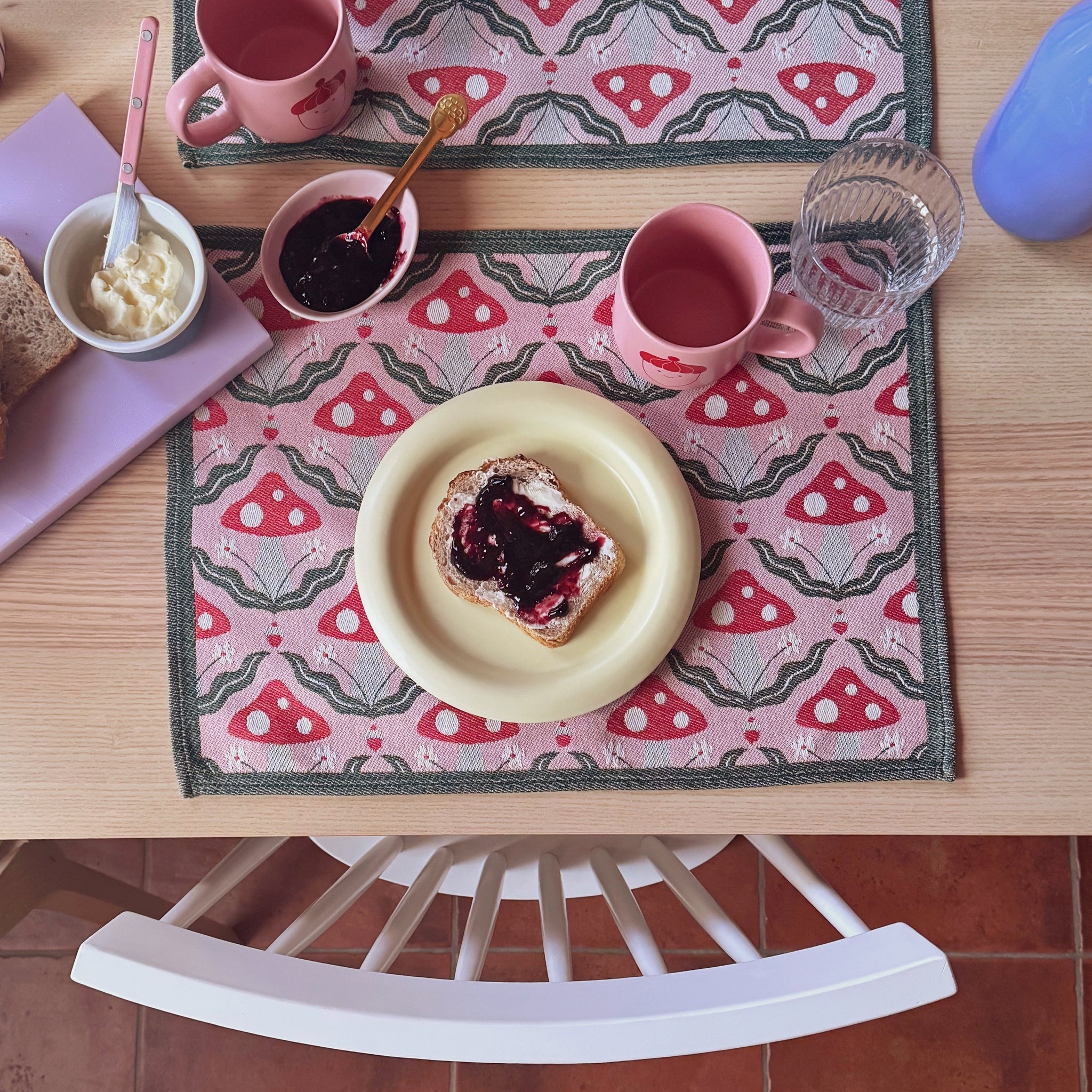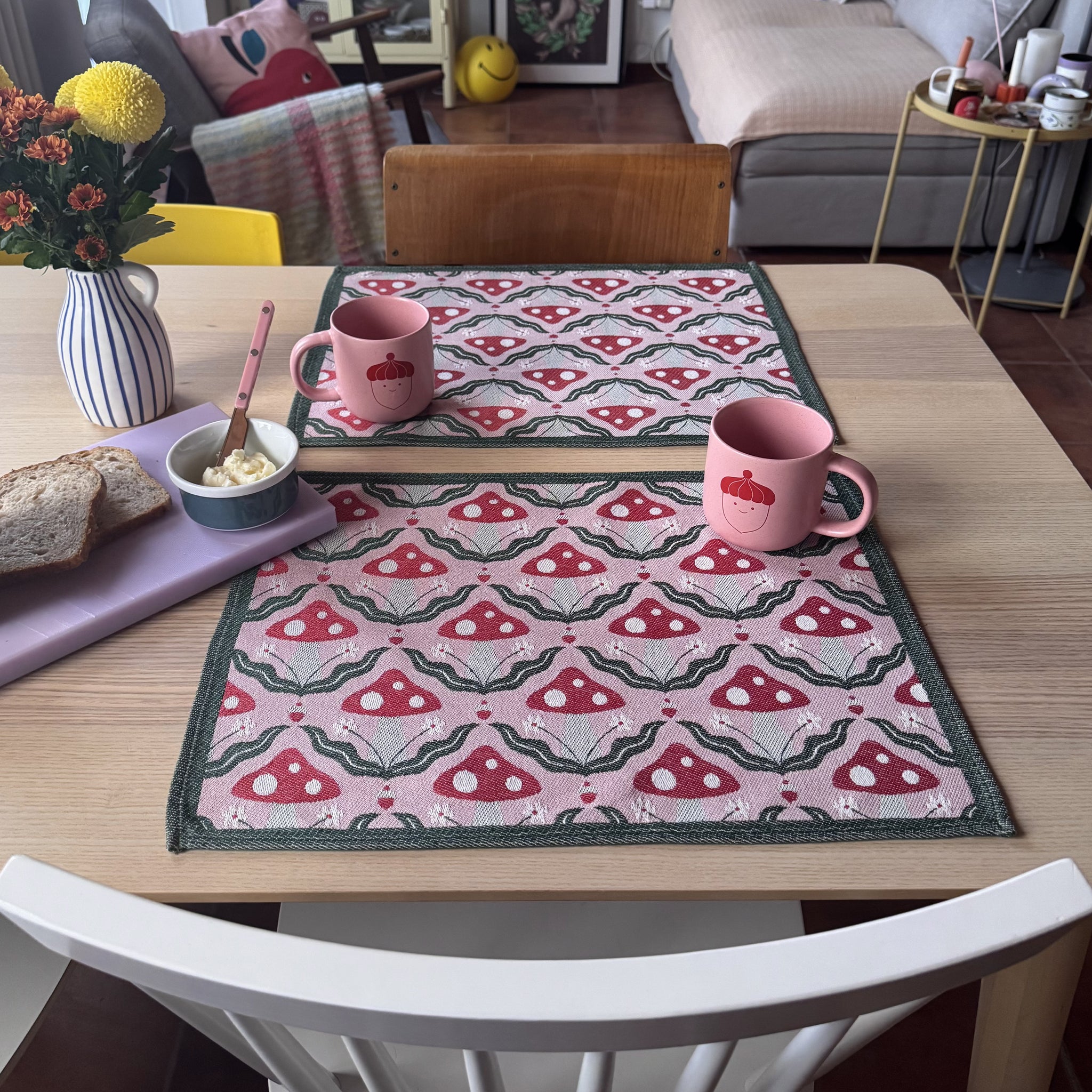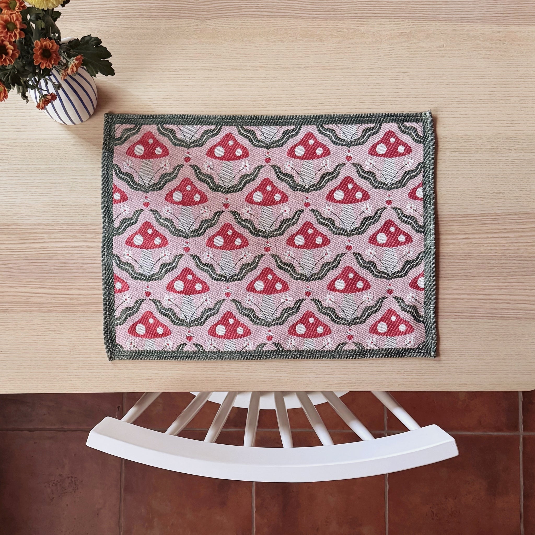 Realizzata in cotone jacquard, questa tovaglietta unisce la qualità del tessuto intrecciato alla delicatezza di un motivo originale disegnato da me.